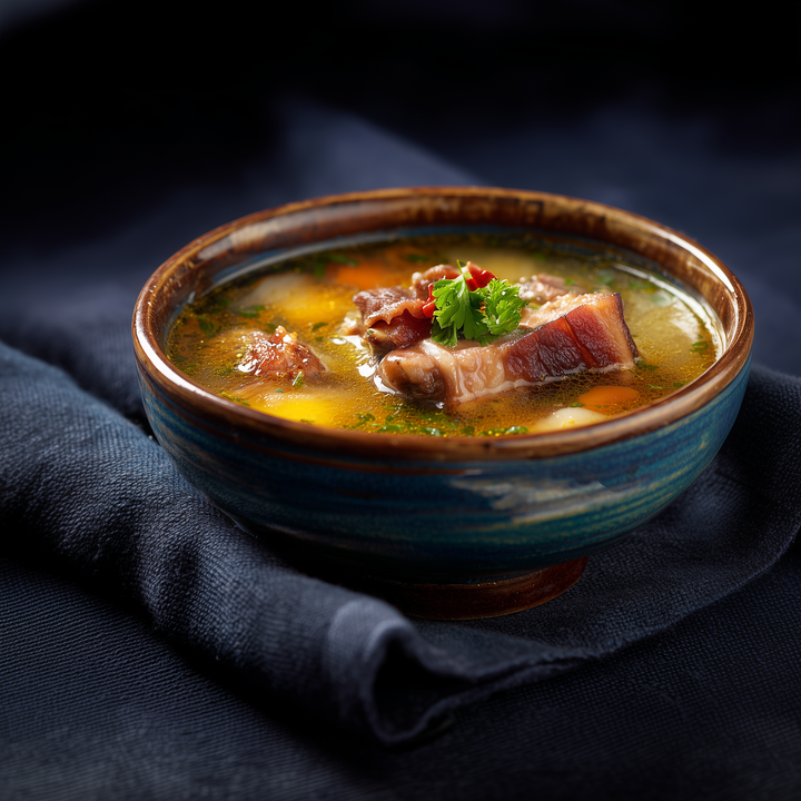 Ciorbă tradițională cu coastă afumată, legume proaspete și borș autentic. Gust echilibrat, reconfortant, cu verdeață aromată.