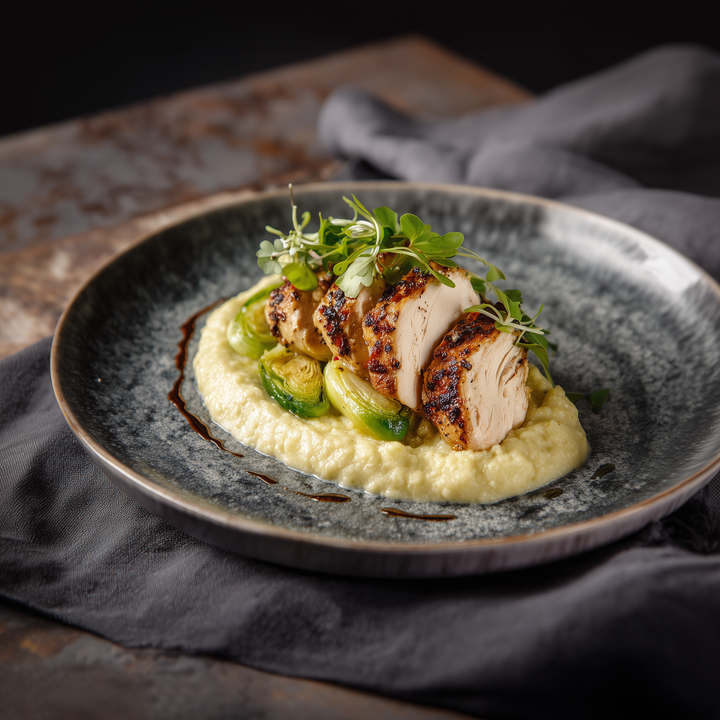 Descriere: Piept de pui fraged, gătit lent pentru a-și păstra suculența, servit cu un piure catifelat de țelină aromat cu unt și parmezan. O combinație elegantă de texturi și arome, cu gust fin și echilibrat — perfectă pentru o masă rafinată și hrănitoare.