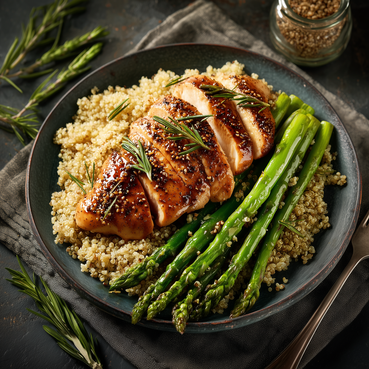 Piept de pui la cuptor, servit cu sparanghel crocant și quinoa roșie, asezonate simplu pentru un gust curat și echilibrat.