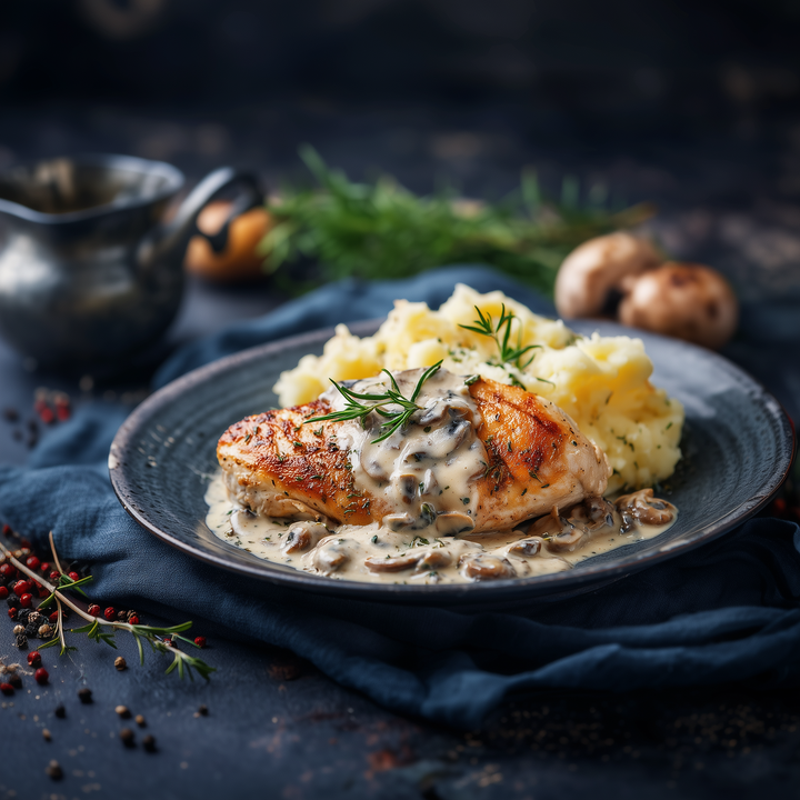 Piept de pui fraged, rumenit la cuptor, servit cu sos cremos de ciuperci și piure de cartofi catifelat, finisat cu parmezan.