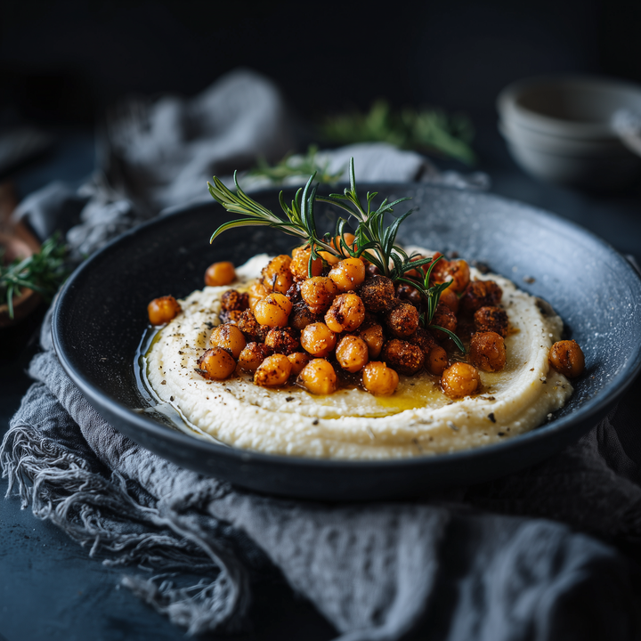 Piure cremos de conopidă cu un strat crocant de năut rumenit, completat de legume ușor sotate, unt și parmezan. O opțiune sățioasă, sănătoasă și reconfortantă.