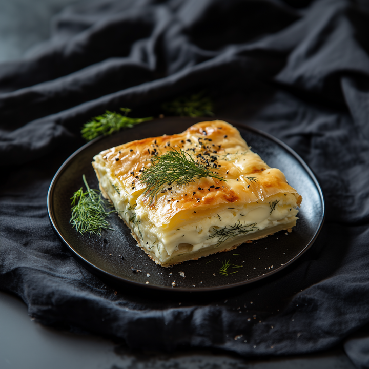 Plăcinta cu telemea și mărar este un preparat clasic reinterpretat cu ingrediente de cea mai bună calitate. Aluatul foietaj rumenit și crocant îmbrățișează o umplutură cremoasă și sărată din telemea de vacă, smântână bogată și unt cu 80% grăsime. Mărarul proaspăt adaugă o notă verde, parfumată, care echilibrează perfect gustul brânzei, oferind un preparat simplu, dar extrem de gustos.