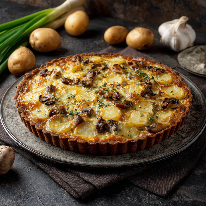 Tartă sărată cu cartofi, praz și ciuperci, legate într-o cremă fină de smântână și brânzeturi, rumenită frumos la cuptor.
