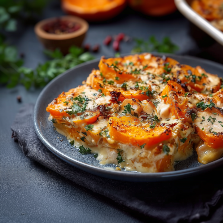 Preparat cu bază fină de cartof dulce și bucăți fragede de piept de pui, legate într-o cremă catifelată de smântână și brânzeturi. Gust echilibrat, ușor dulceag, completat de aromele proaspete ale cepei verzi și parmezanului, perfect pentru o masă caldă de prânz sau o cină savuroasă.
