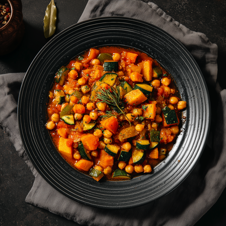 Tocană vegetală bogată, cu năut cremos, legume dulci-aromate și un strop de scorțișoară pentru un gust cald și reconfortant.