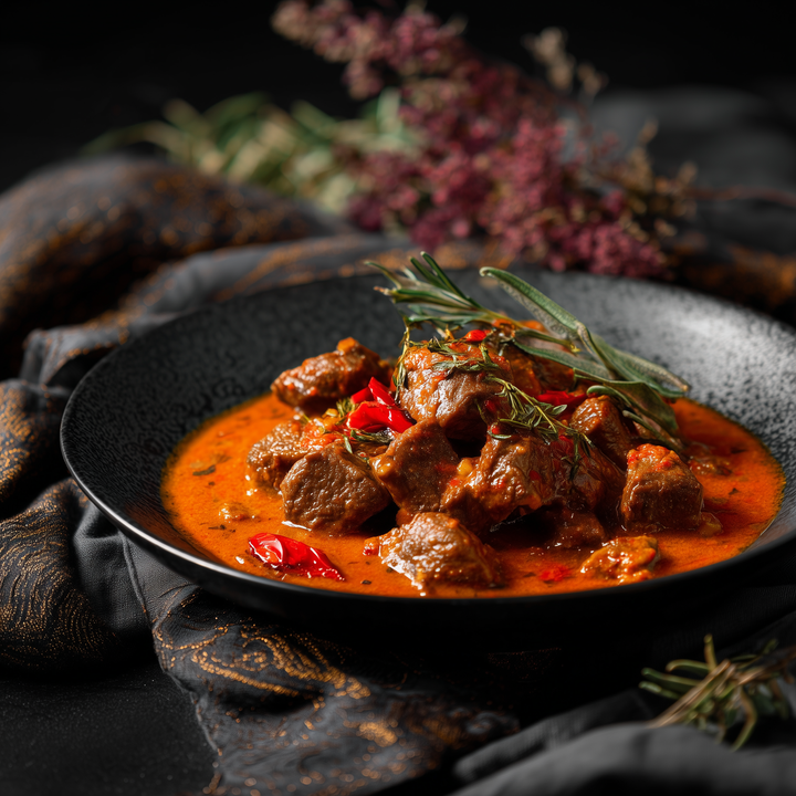Tocană fragedă din pulpă de vițel în sos bogat de ardei kapia copt, cu legume și cimbru. Comfort food în stil casnic.